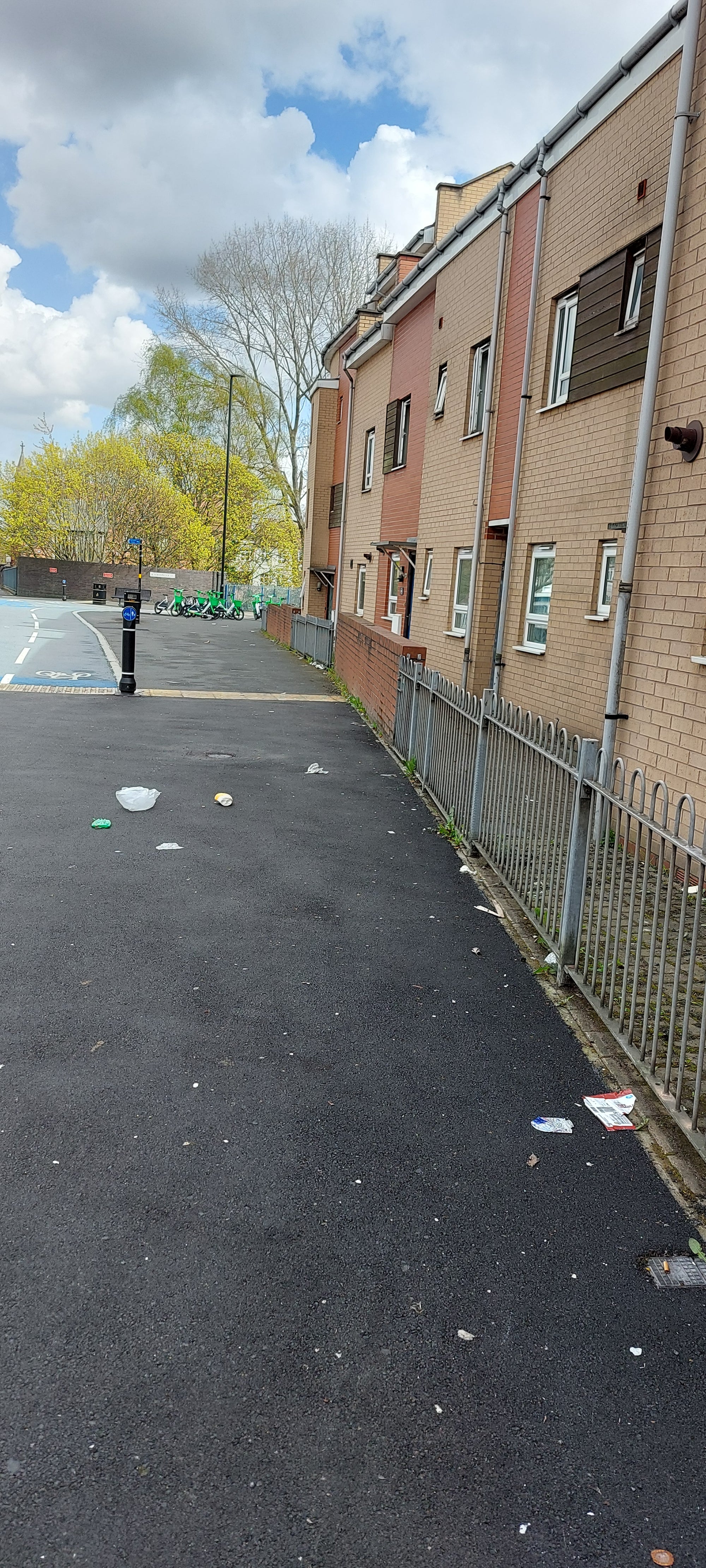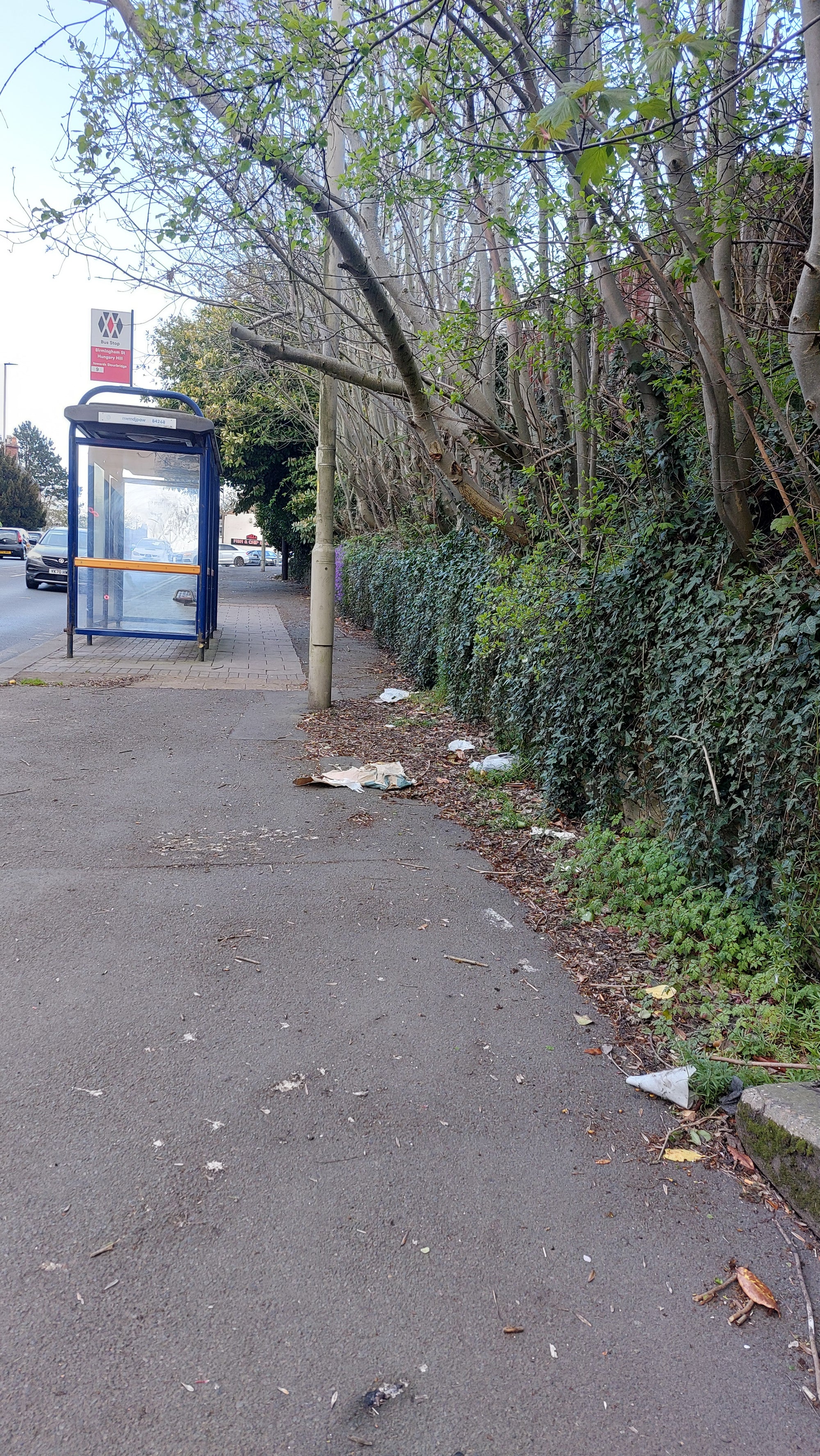 Cleared from hedge and pavement edge. Bottles, wrappers, takeaway waste.