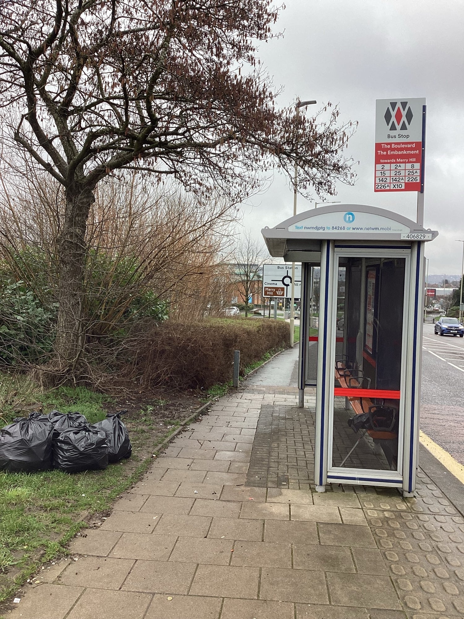 Merry Hill — DY5 Bus stop near The Boulevard. four bags cleared from hedge and pavement edge. Bottles, wrappers, takeaway waste. Bags accepted at the local KFC. Manager stepped out and helped carry them to the proper waste disposal area. No fuss. Just shared responsibility.